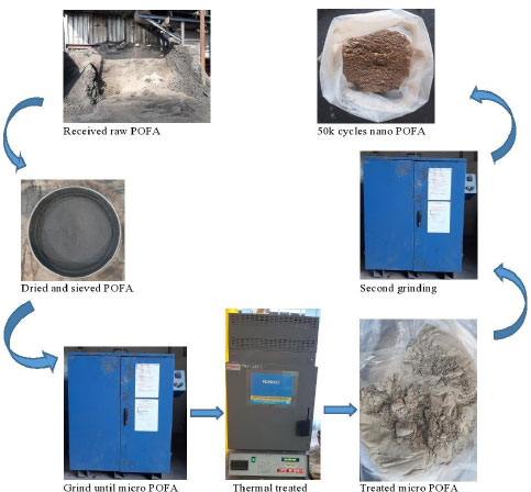 The raw POFA was collected from the palm oil mill located at Gambang, Pahang, Malaysia, and kept in the Concrete Lab University Malaysia Pahang. POFA was dried in an oven with a temperature of 100 ± 5 °C for one day to remove the excess water moisture in the ash before being further processed. Next, the dried raw POFA was sieved through the 300 μm sieve to remove the excess unburnt carbon. To further reduce the sieved POFA’s particle size to less than 45 μm, the dried sieved POFA was ground in the LA abrasion machine with a grinding speed of 33 rpm for 10,500 cycles with a dosage of 3 kg per round. To ensure that the particle size of the ground POFA was less than 45 μm, around 100 g of ground POFA was obtained after each round of grinding and sieved through the 45 μm sieve. Each batch of ground POFA was kept only if the passing rate of the ground POFA was more than 90% passing through the 45 μm sieve according to the standard, ASTM C618-2019. The ground POFA was burnt in the furnace at the temperature of 600°C for 2 hours to fully remove the unburned carbon in it. Until this stage, this POFA was marked as micro POFA.