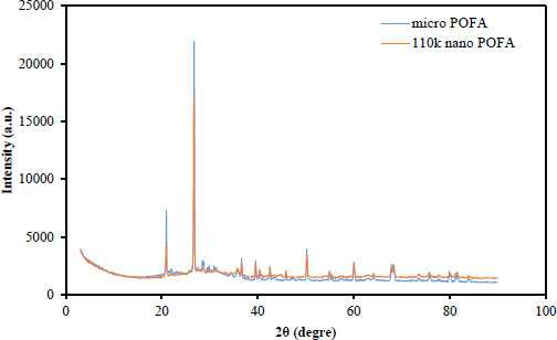 • Upon conducting the grinding process for the second time, the LOI values of all nano POFA increased compared to the micro POFA. While a combination of the thermal treatment and mechanical grinding process improved the sum of chemical content (Al2O3, SiO2, and Fe2O3) to 75.38%. The crystalline phase of the micro POFA and nano POFA demonstrated no significant changes, but a reduction in the peak intensity was found for the 110k nano POFA compared to the micro POFA. Overall, the XRD showed both POFA to be major in quartz with low crystallinity.