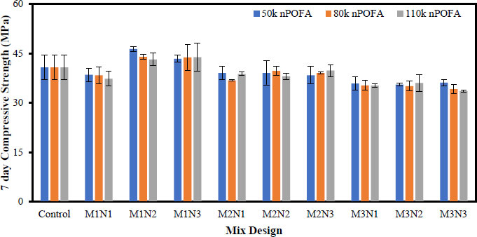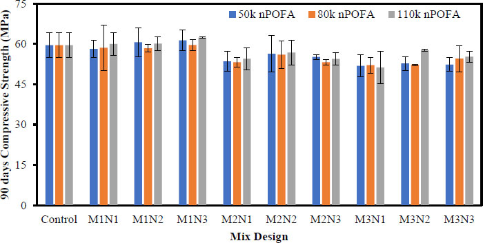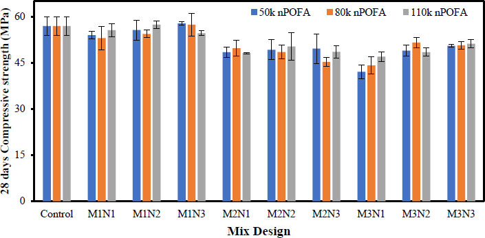 • 50k cycles nano POFA-based mortar performed better in terms of CS than other nano POFA at the curing age of 7 days. However, the 110k cycles nano POFA-based mortar had a higher CS at the following curing ages.