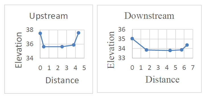 HEC-RAS 5.0.7 software is used to analyze the water level. Input data includes the existing river geometry data in the form of cross and long sections, riverbed slope (S), channel roughness (Manning's n coefficient value), and the designed flood discharge [29, 30]. There are 41 cross sections selected along the Kinunang River. The characteristics of the Kinunang River channel are shown in Table 9. The upstream and downstream of existing cross-section data are shown in Fig. (5).