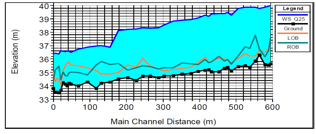 Simulation was executed with Manning's roughness (n) value for vetiver grass, shrub grass bamboo plants. These three types of plants were chosen because they were abundant at the site. The simulation results of the water level with each plantation of the 25-year return period flood discharge are shown in Fig. (10). The results indicate that all cross sections planted with vetiver grass, shrub grass, and bamboo plants are able to accommodate flood discharge. The highest water table is the one using vetiver grass, followed by bamboo plants, and the lowest is bush grass. This occurs because the roughness level of vetiver grass is the greatest compared to bamboo plants and shrub grass.