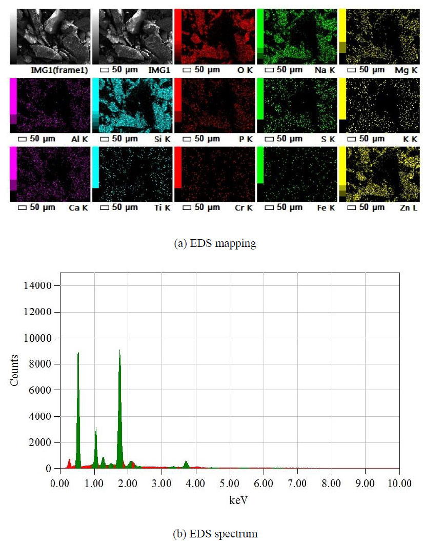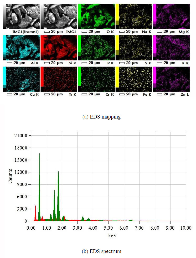 An X-Ray Fluorescence (XRF) spectrometer is a versatile tool for non-destructive chemical analysis of various materials, including geological samples. By utilizing the interaction of X-rays with atoms, XRF spectrometers can determine the elemental composition of rocks, minerals, sediments, fluids, etc. An XRF facility (Model: XEF-1800 SHIMADZU), as shown in Fig. (3a), available in the NCE department of BUET, was used to determine the chemical composition of the untreated soil and WGP samples. The surface of the samples can be observed in high resolution using a Scanning Electron Microscope (SEM), which enables a thorough analysis of their morphology. Additionally, Energy Dispersive X-ray Spectroscopy (EDS) determines the sample's elemental composition by detecting X-rays emitted when the sample is exposed to an electron beam. Together, SEM-EDS allows for simultaneous imaging and elemental analysis. A SEM facility (Model: JEOL JSM-7600F instrument operating at an accelerating voltage of 10 kV and a probe current of 1.0000 nA), available in the NCE department of BUET, was used to determine the elemental composition and map the untreated soil and WGP samples, as shown in Fig. (3b). The images were captured at magnifications of 1000X and 300X. Elemental maps were also obtained to observe the spatial distribution of key elements in the soil and WGP samples.