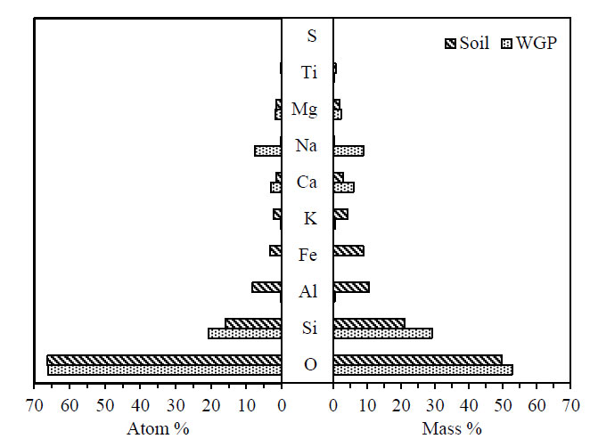 Quantitative elemental composition of soil and WGP from EDS analysis.