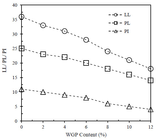 The effects of WGP on the liquid limit, plastic limit, and plasticity index of soil-WGP mixtures for different percentages (i.e., 2%, 4%, 6%, 8%, 10%, and 12%) of WGP by dry weight are illustrated in Fig. (9). As shown in Fig. (9), due to the addition of WGP, the liquid limit reduced from 36 (untreated) to 18 at 12% WGP, while the plastic limit decreased from 25 to 14. As a result, there was a corresponding decrease in plasticity index from 11 to 4. Other researchers also reported similar observations [28, 36, 37, 53, 73, 74]. This behavior can be attributed to the increased workability, reduced water retention capacity, and reduced long-term compressibility potential of the treated soil, which are many of the primary requirements of soil stabilization techniques.