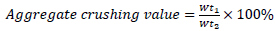 The aggregate was sieved through 2.36 mm sieves. The weight before the Test recorded as Wt1. The aggregate dries in an oven at a temperature of 105°C for 4 hours and allows cooling. The test sample was placed in three layers in a cylinder each layer being subjected to 25 strokes of the tamping rod. The surface of the aggregate was then leveled, and the plunger was inserted and ensured it rested horizontally on the surface of the aggregates. The apparatus with the test sample and plunger was then placed in position between the platens of the testing machine and loaded at a uniform rate to the required load and the crushing load was 400KN. After loading, the crushed material was removed from the cylinder and sieved through a 2.36 mm sieve. The fraction passing the 2.36 mm sieve was then weighed and recorded as Wt following BS 812-110 [45]. The aggregate crushing value is expressed in Eq. (3).