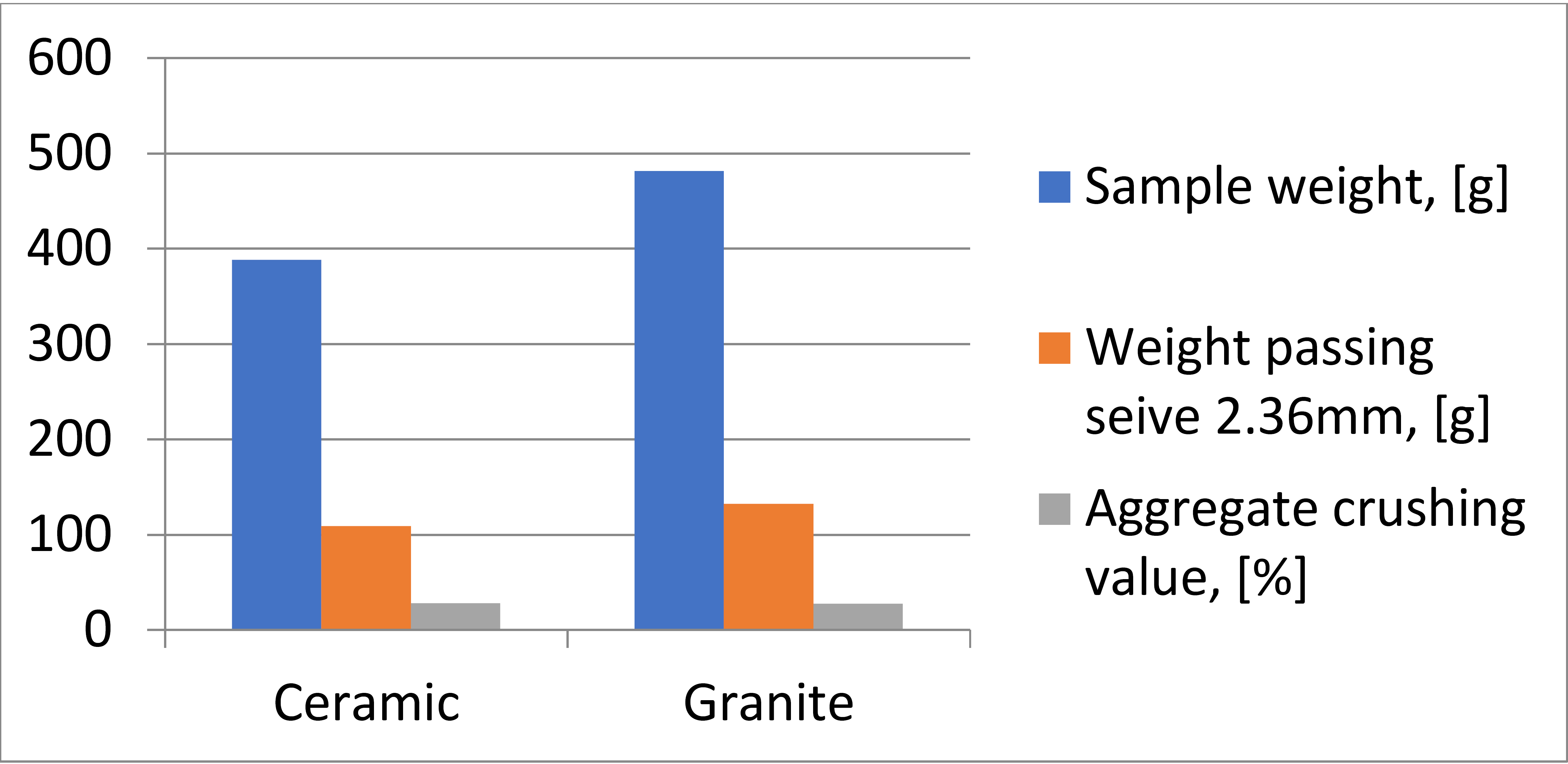 Table 4 and Figure 3 show the result of the crushing value test of ceramic tile and granite aggregate, and the crushing load was 400 kN. The values of the granite and ceramic tile aggregate that passed through the sieve 2.36mm were 132.41g and 109.0g. The percentage of the aggregate crushing value for ceramic tile aggregate was found to be 28.06% while the aggregate crushing value for granite aggregate was 27.50%. Though the granite aggregate was found to have a higher ability to resist crushing than the ceramic aggregate, both still fall within the range of aggregate crushing value (27% to 31%). According to BS 812 part 110: 1990 [45], the percentage of the aggregate crushing value should fall within the range of 27% to 31% and which is within the range.