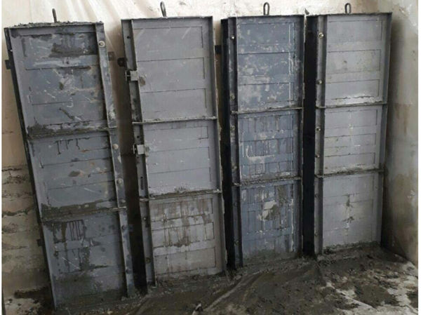 Four steel molds were designed for casting four hybrid deep beams for each batch as shown in Fig. (2). The inside dimensions for each mold were 1500mm length, 350mm height and 150mm width. The molds were designed to cast the beams vertically due to the difficulty of casting layers in horizontal state. The lower plate was fixed to cast the first layer while the two other plates above were movable (doors) to cast the two other layers. Each door was closed before casting the layer of beam in reverse it.