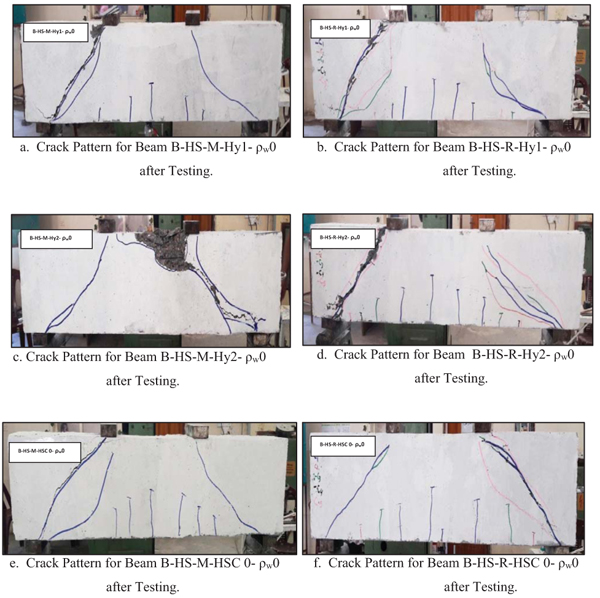 In monotonic loading, At low load levels, the faults in this structure and the cracks did not appear at any spot and the deflections at mid span are slight proportionate to the applied load, because the beams tested behaved in an elastic manner. After the initial flexural cracks was detected and many other flexural cracks, the first diagonal cracks (web shear crack) appears at the diagonal region bounded by load and support positions. Because of the large depth of the beams, observation of the two types of cracking are plainly concurrent, where the flexural crack foregoes the shear crack in most beams while it was delayed in other beams. Since the crack propagates in a manner perpendicular to direction of tension stress, then spread of the flexural cracks through a vertical direction though spread of the shear cracks through a diagonal direction. As the load is otherwise increased, the inclined cracks develop and spread toward the support and load locations. Also, new cracks form similar to the initial shear crack and new cracks form nearer support were appeared. In repeated loading, at the first cycle, the behavior of deep beam specimens were like to the behavior of beams under monotonic loading until the load reached the required load level. Failure occurs by splitting the beam into two parts approximately along the line connecting the brink of steel blocks at the support and load locations expect B-HS-M-Hy2-ρw 0 failed in flexural(crushing compression chord). Details of the tested beams and results obtained are shown in Table 4. Fig. (3a-f) shows mode of failure and the crack pattern of the tested deep beams.