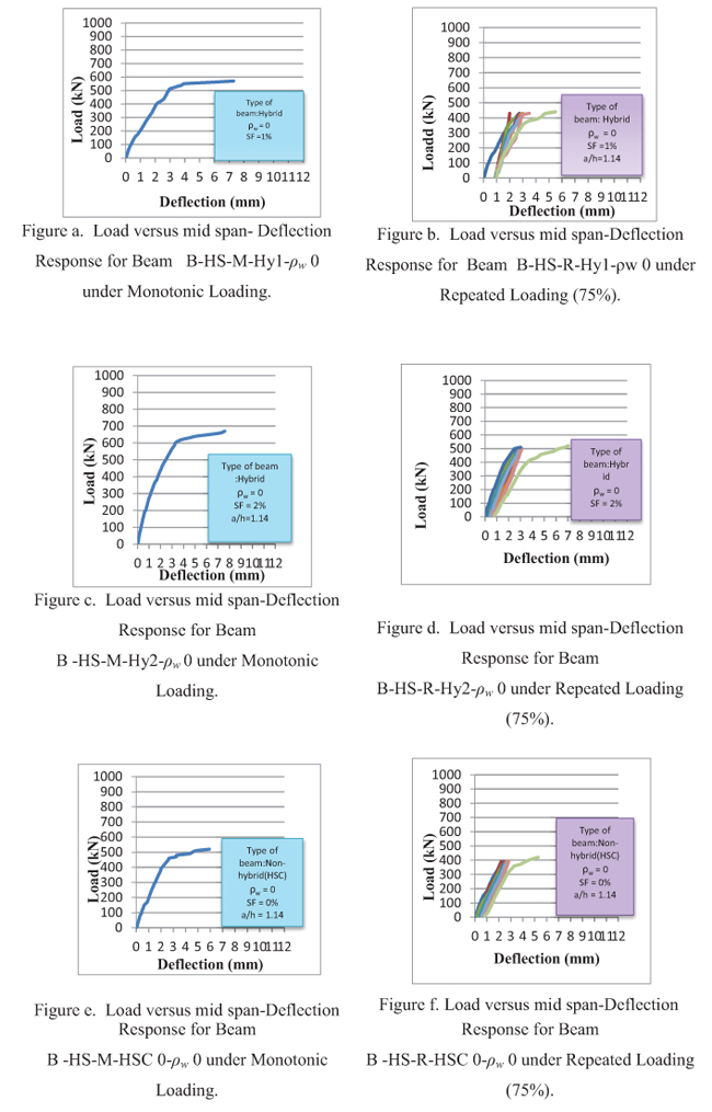 Figs. (5a-f) shows the load-deflection response curves obtained for the all tested deep beam specimens which were tested under monotonic and repeated loading.