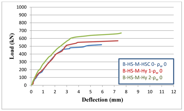 The ultimate load for hybrid beam with SF ratio of 2% (B-HS-M-Hy2-ρw 0) and SF ratio of 1% (B-HS-M-Hy1-ρw0) increased by 28.85% and 9.62%, respectively with respect to which beam B-HS-M-HSC 0-ρw0 is cast without SF. The presence of SF in shear span regions for hybrid deep beams contributes in fostering resistance of hybrid deep beams in the absence of web reinforcement. Also, the percentage increase in ultimate load is 17.54% as the SF ratio increased from 1% (B-HS-M-Hy1-ρw 0) to 2% (B-HS-M-Hy2-ρw 0).