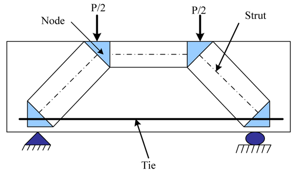 STM is a method of designed for reinforced concrete that reduces complex of stress within a structure. STM consists of strut and tie connected at node to form an idealized truss. For idealized truss, the compression members express them struts that symbolize concrete, the tension members express the ties that symbolize by steel reinforcement and nodes are the joints. Fig. (7) shows three elements that the STM consists of. The capacity of a STM according to the lower-bound theory of plasticity will be lower than or at mostly equal to the actual load of structure. Failure of STM can occur happen due to a diagonal splitting in strut, crushing of nodal zone, the ties yielding, or the ties anchorage is a failure [4].
