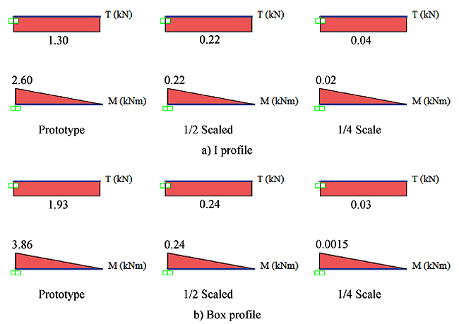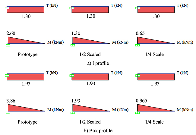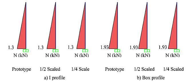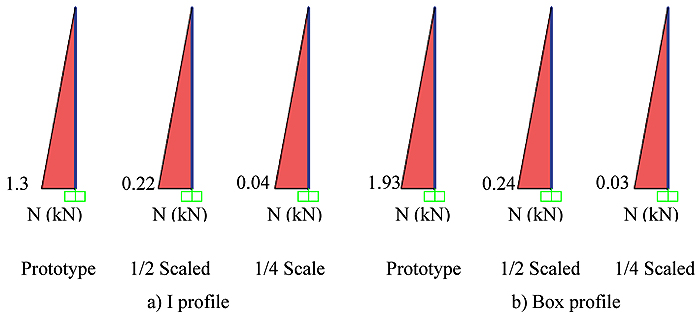 In the study carried out on the steel bearing systems, the sizes available in the steel tables are used because each dimension of the steel profiles cannot be scaled in the desired area. A geometric and mass scaled is applied as scaling type.