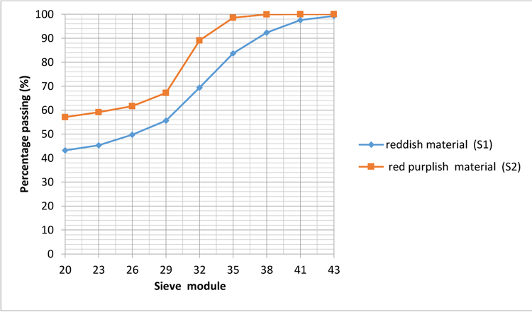 Table 3 shows that WL and Wp of the reddish material (S1) are respectively 60.60% and 43.77%. Its plasticity index is 16.83%. The liquidity and consistency indices are respectively -1.17 and 2.17%. These values show that the material S1 is a plastic soil found in the solid or semi-solid state, having a very soft consistency. Concerning the red purplish (S2), WL, Wp, Ip, IL, and Ic are 63.1%, 56.07%, 7.03%, -4.38 and 5.38%, respectively. These values show that the material S2 is a little plastic soil found in the solid or semi-solid state and having a very soft consistency.