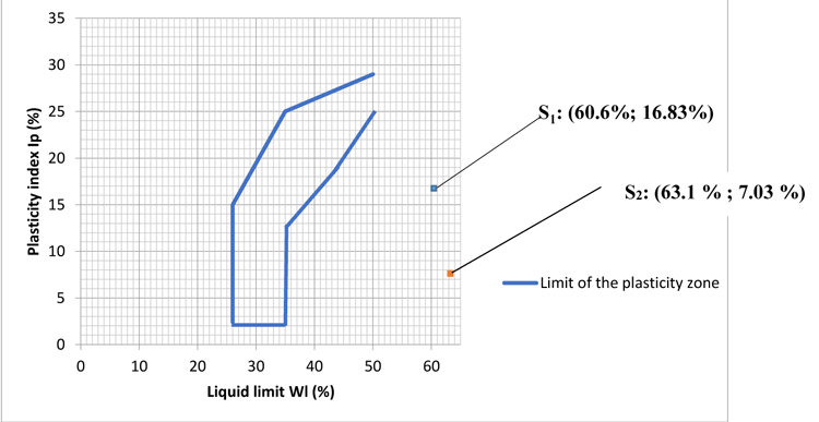 According to the Casagrande plasticity abacus [15], the values ​​of the plasticity index show that the materials S1 and S2 consist of inorganic clays. The absence of organic matter in these clays shows that these materials do not present any plant contamination. According to the soil classification scale, the material S1 is a plastic soil of very soft consistency and S2 is a low plastic soil of very soft consistency. The position of the points representing the materials studied in the plasticity diagram is presented in Fig. (2).