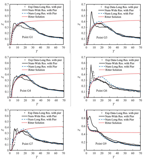 Fig. (2) shows a comparison between the three-dimensional numerical model for both long and wide reservoirs, Ritter analytical solution and experimental data for variations in water level at the points G1, G3, G4, G6, G7 and G9. In these figures, the Z dimensionless values vs. T are plotted.
