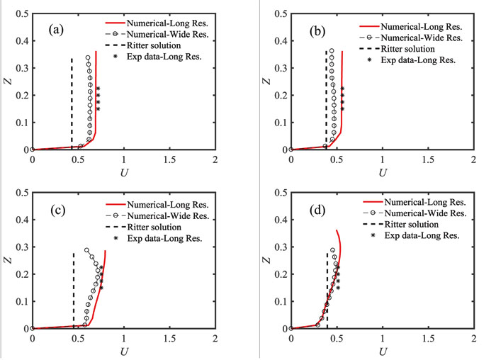 Fig. (3) shows the distribution of the velocity obtained by 3D numerical model and the Ritter’s analytical solution at the flow depth in vs. the experimental values for long and wide reservoirs. The relative difference between each method with experimental data for long reservoir is presented in Table 4. The curves in Fig. (3) are mapped as dimensionless at points G2 and G6. In these diagrams, the dimensionless parameters U and Z are defined as Z = h / h0 , where u is the flow velocity in the direction x, h0 is the initial level of water in the reservoir, h is the depth of flow and g is the acceleration of gravity. Eq. (6) is also used to calculate U by Ritter's analytical solution: