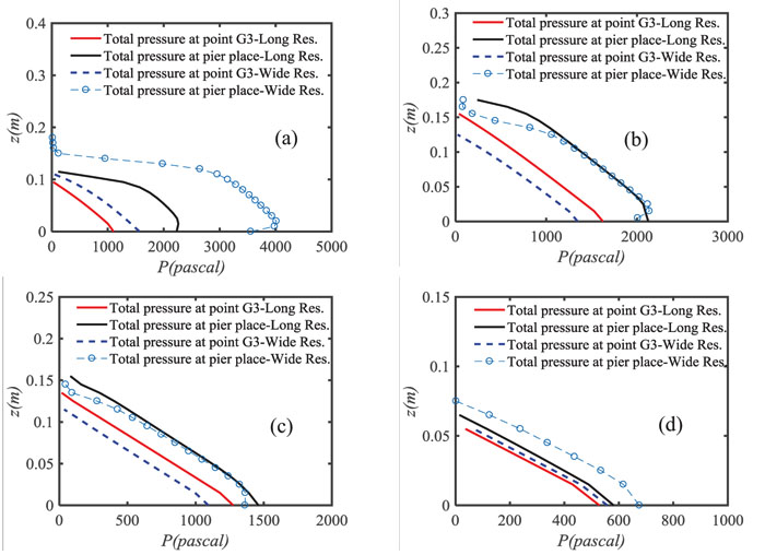 Fig. (4). Distribution of pressure in depth using the results of the numerical model at point G3 and the bridge pier for long and wide reservoirs at (a) t = 1s, (b) t = 3s, (c) t = 5s and (d) t = 10s.