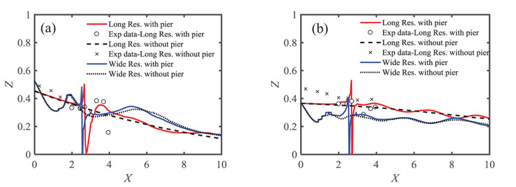 Fig. (5a) shows the longitudinal profile of water level with and without pier at t = 2s for long and wide reservoirs. Accordingly, in the channel connected to the long reservoir and at a distance between the gate and 100cm farther (toward the pier), the water level variations for the pier presence are less than the absence of pier. The reason for this is the effect of the pier on the flow lines and the contraction of the flow in this range. After this distance, the changes in the water level in the model with pier are altered at the gate downstream compared to the model without pier. The sudden increase in water level is also observed within the distance of 100 to 150 cm from the gate. The main reason for sudden increase in water level is the existence of wake vortices at this distance. According to Fig. (5a), at 0.5 m distance from the gate, the water levels profile of the wide reservoir has a sudden drop (for the cases with and without pier) while this water level has increased at a distance of 0.8 m from the gate. After this increase, the water level profile decreases until the flow hits the pier. As discussed above, the reason for this is that the transverse waves are reflected from the channel walls causing the formation of crests and troughs on the water level profile of this reservoir. Similar to the long reservoir, the wake vortices are created behind the pier and the water level increases compared to the absence of pier.