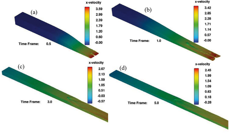 Fig. (6). Flood wave motion caused by dam break around the pier with long reservoir at (a) t = 0.5s, (b) t = 1s, (c) t = 3s and (d) t = 5s.