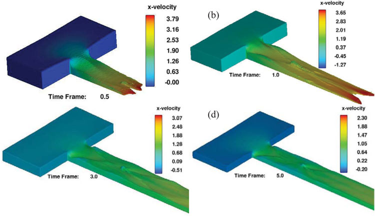 Figs. (6 and 7) illustrate the flood wave motion at different times for the channel connected to the long and wide reservoirs. The backflow of the wave into the long reservoir is clearly visible in Fig. (6). Based on the images, in the first moments after the dam break, the flood wave moves at a high velocity towards the downstream. Since the pier is located in the middle section of the channel connected to the long reservoir, it causes the waves to collide with the side walls and its re-entry into the channel, which results in transverse waves. In addition, because of the presence of pier, the wake vortices are clearly visible behind the pier. Over time, with the reservoir drainage, the intensity of the outflow is reduced and the wake vortices lose their effect. According to the images, the maximum longitudinal component of velocity decreases, which is due to the drainage of the long reservoir and the reduction of the level of water flow on the outlet. Fig. (7) shows that the flood wave motion of the downstream channel connected to wide reservoir is different due to its geometry. Accordingly, in this reservoir, in the initial moments after the dam break, the flood wave moves with higher velocity but with the faster attenuation towards the downstream than the long reservoir. Due to the creation of cross-waves at the reservoir downstream, water level variations are fluctuating and these fluctuations continue throughout the channel. Due to the presence of the pier in the middle of the channel connected to the wide reservoir, the wake vortices behind the pier collide with cross-waves and make the flow more turbulent in this zone.