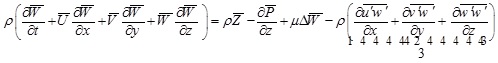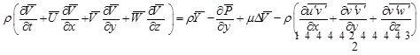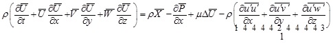 , and are average velocity values in three directions x, y and z, and , and indicate the Coriolis forces in three coordinate directions. The terms 1, 2, and 3 in Eq. (2), (3) and (4) in averaged time-dependent Navier-Stokes are called Reynolds stresses.