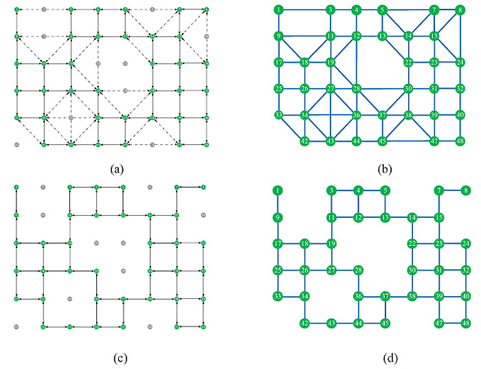 We computed the shortest path and the distances between two signalized intersections. According to the definition of the graph connectivity in section 2.1 and supposed the distance threshold is 0.6 km, the connectivity of neighboring intersections is shown in Fig. (2a). The points in red and green are the signalized intersections, and the points in grey are the unsignalized intersections. The solid line means that two nodes have connection without passing unsignalized intersections. The dotted line means two nodes have connection via an unsignalized intersection. The concise graph connectivity of all nodes and their connections is shown in Fig. (2b). If supposed the distance threshold is 0.4 km, the graph connectivity is the same with the graph connectivity by the method SMOO, shown in Figs. (2c and d). It means the distance threshold is critical to determine the graph connectivity.