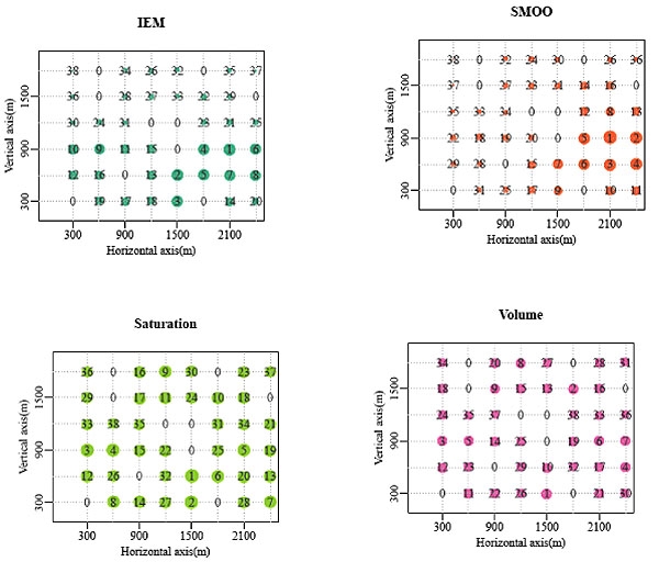 The priority orders by the four methods are plotted in Fig. (3). Here the IEM means the priority order sorted by the current paper, SMOO means the method in work of Lu and Wagner [12], the volume method means by the traffic volume entering intersection in descending order, and the saturation method means by the intersection’s saturation degree in descending order and the saturation degree is the maximum of intersection’s entering lanes’ saturation. The size of the point indicates intersections’ importance, the larger the size, the higher the importance. The number on the point is the exact priority order of the intersection. Fig. (3) shows that the intersection with the highest priority by IEM and SMOO are the same, which is intersection 31. The intersection with the highest priority by the volume method and is the same with the second highest priority by the saturation method, which is intersection 45.