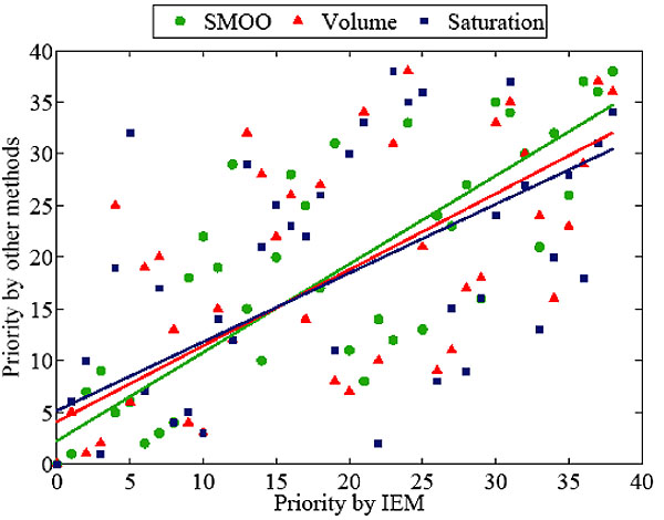 Fig. (4) displays the correlation of the priority order between the Importance Estimation Method (IEM) and the other methods. It shows that there is no high correlation among these methods. The method SMOO is closer to the revised one (R2 = 0.73) than to the volume method (R2 = 0.44) and the saturation method (R2 = 0.54), respectively. This would also explain the importance of intersection has a lot to do with the graph connectivity.
