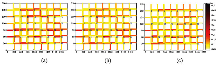 We first sort the signalized intersection’s priority at time t by the network’s graph connectivity and the importance estimation model (IEM). Then we optimize the signal plans by TRANSYT 15, and update the signal plans in simulation software of Synchro. After running simulation in SimTraffic in Synchro, we get the renewed traffic volume and saturation degree of links. Thirdly, we apply only the Importance Estimation Model (IEM) to the network with renewed volume and saturation, since the graph connectivity of network keeps the same, to get the priority order at the next period. Generally, the priority sorting result at t + i is obtained by applying the importance estimation model (IEM) to the sorting results at t + i - 1 with the renewed link volumes and saturation at t + i. In simulations, we set the initial sorting at t = 7h and repeatedly run the priority sorting model with increase step of 20 minutes until t = 8h, when the network tends to be homogeneously uncongested. The saturation degrees of links of network from t = 7h to t = 8h are shown in Fig. (6). We see clearly that the links’ saturation degree decreases with time from Fig. (6a to c). It means that the optimal priority order can help decrease the saturation of links. It also shows that the Importance Estimation Model (IEM) can capture the shift of the congested intersection.