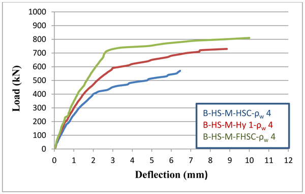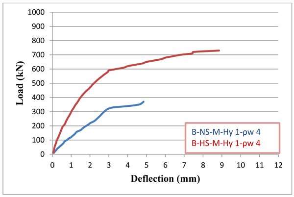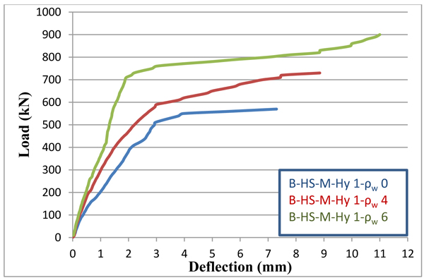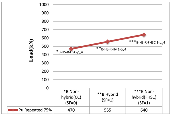 From the experimental test results, when beam cast with fibrous with SF of 1% concrete along entire length, the ultimate load of 10.96% increased as compared with hybrid beam. And it was observed to increase as much as 32.78% as compared with beam cast from conventional high strength concrete under monotonic loading. Under repeated loading of 75% control ultimate load, the ultimate load for beam cast with fibrous concrete along entire length increased as much as 15.32% as compared with hybrid beam. And it was seen to increase 36.17% as compared with the beam cast from conventional high strength concrete. The percentage increase in ultimate load of hybrid (SF ratio 1%) deep beam cast with high strength concrete became 97.3% as compared with the identical beam cast with normal strength concrete under monotonic loading and (98.21%) under repeated loading (load 75% control beam load). The percentage increase as ultimate load for hybrid beam cast with SF ratio 1% was 9.62% as compared with hybrid beam with SF ratio 0%. As the web reinforcement increased from 0 to 0.004 and from 0 to 0.006, the percentage increased in the ultimate load as 28.07% and 57.89%, under monotonic loading as 26.14% and 59.09%, under repeated loading.