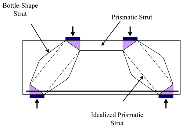 - They assumed that for beams in which bearing and anchorage failures at the nodes are prevented, shear capacity is governed by the compressive capacity of the strut and the mean stress in the strut depends on its dimensions. The strut is assumed to have a uniform width (prismatic strut) defined by geometry of the node at the support.