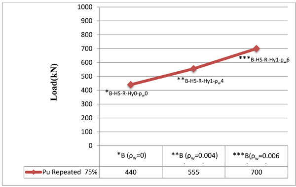 - The decreased percentages in the ultimate load according to the repeated loading of hybrid deep beams which have web reinforcement (0.004 and 0.006) as variable are convergent which are 23.97% and 22.22%, respectively.