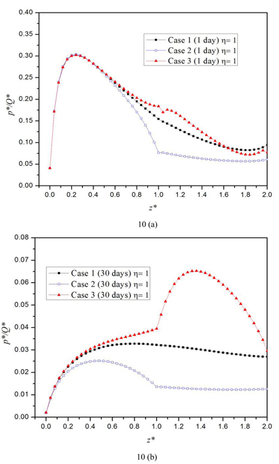 Figs. (8 and 9) show that the influence of the permeability of the middle layer is almost negligible. Also, it can be seen that for all three cases, the vertical displacement increases as time increases. Moreover, both the axial force and vertical displacement decrease with the depth. Besides, as illustrated in Fig. (10), the permeability of the middle layer has a significant influence on the pore pressure. The pore pressure is the largest when the half-space’s middle layer is less permeable, i.e., Case 3, and smallest when the middle layer is highly permeable. The pore pressure at 30 days is much smaller than that at one day, which indicates that the pore pressure will dissipate with time for all three cases. Fig. (10a) shows that at the time of one day, the variation of the pore pressure for the three cases are similar: it first increases with the depth; then, it achieves a peak value at certain depth in the first layer; lastly, it will decrease with the depth.
