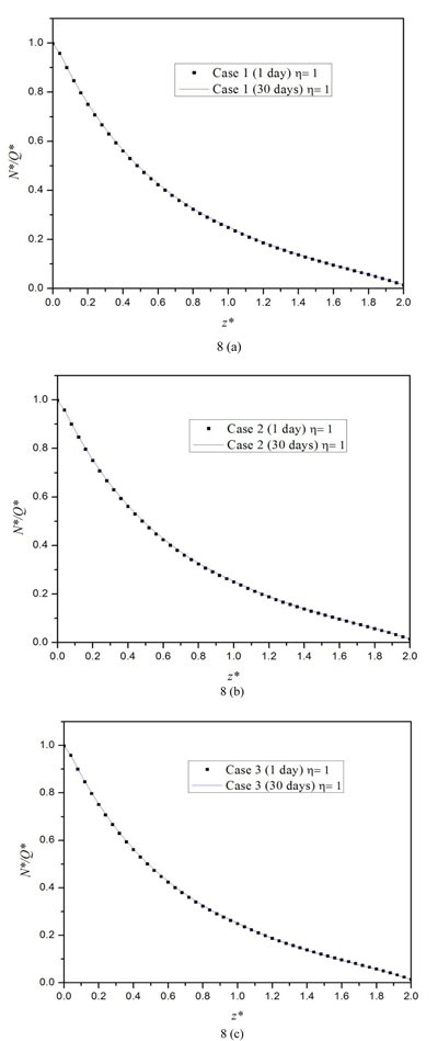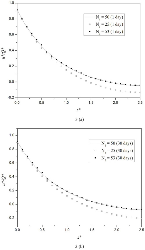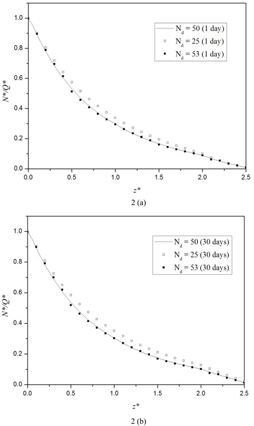 In this section, three different discretization schemes corresponding to three total numbers of the discretization segments of the pile, namely, Nd = 25, 50, and 53, are used to examine the stability and convergence of the proposed numerical model. For all three schemes, the stiffness ratio η = 0.5 is used for a stratified soil consisting of two overlying soil layers and one underlying half-space layer with the shear moduli ratio µv1: µv2: µv3 = 1:1:2. The values of the soil parameters are tabulated in Table 1 and the pile parameters are as follows: length L = 20m, radius R = 0.25m, and the Young’s modulus Ep = 2.6 × 109Pa. The solutions for the times of 1 day and 30 days (s) are considered in this example. The thickness, shear modulus µv and coefficient of vertical permeability kv of the first soil layer are chosen as the reference length LR, reference shear modulus µR, and reference coefficient of permeability kR, respectively. As shown in Figs. (2 and 3), the non-dimensional pile axial force N* and vertical displacement u* of the pile become convergent when Nd = 50-53. Therefore, in all numerical examples in this study, the total number of segments Nd = 50 is used.