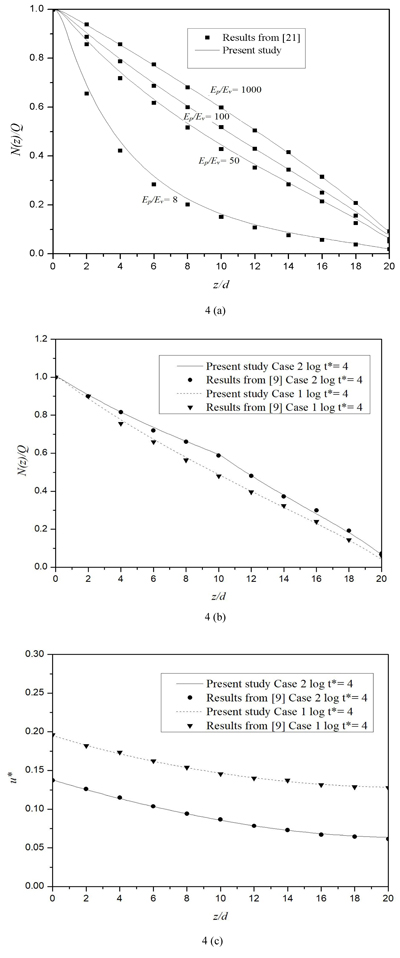 Niumpradit & Karasudhi [21] obtained the final solution for the axial force of the axially loaded pile embedded in the isotropic poroelastic half-space. To compare our results with the final solution of [21], the time is assigned a large value and the relevant parameters are set as: the pile length-diameter ratio L/d = 20; the soil Poisson’s ratio vh = vhv = vvh = 0.25 and, η = Eh / Ev = 1 where Eh and Ev are the soil’s horizontal and vertical Young’s moduli. As depicted in Fig. (4a), the pile axial forces corresponding to the above parameters and different pile-soil Young’s modulus ratio (Ep / Ev) obtained by the proposed model in this study agree with those obtained by Niumpradit & Karasudhi [21], thus, validating the proposed model.