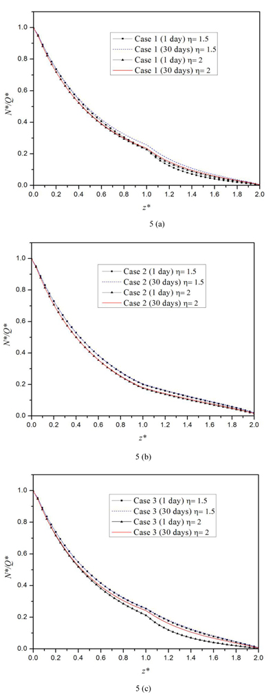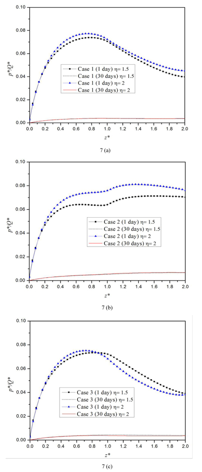 Fig. (5) shows that for all cases, the axial force of the pile decreases with the increase of the depth. In addition, both the stiffness ratio and the Young’s modulus of the middle layer have a little influence on the axial force of the pile. However, at some depth near the soil interface, the axial force of Case 3 is smaller than those of the other two cases. Similarly, Figs. (6a, b) shows that the vertical displacement of the pile also decreases as the depth increases. It is also shown in Fig. (6) that for both Cases 1 and 2, a larger stiffness ratio corresponds to a larger vertical displacement. The vertical displacement increases with time in the harder middle layer case, and it decreases with time in the softer middle layer case. As depicted in Fig. (7a), the pore pressure on the pile-side tends to zero as the time increases. For all three cases, the pore pressure at the top of the pile vanishes, since the top of the half-space soil is assumed to be permeable. For both Cases 1 and 3, the pore pressure first increases and at one depth it reaches a marked peak and then it decreases. For both the hard and soft middle layer cases (Cases 1 and 2), the pore pressure increases with the increase of the stiffness ratio, while for the case of homogeneous half-space (case 3), there exists an intersection point in the second layer. Before this point, the pore pressure increases with the increase of the stiffness ratio; after the point, opposite scenario occurs. Meanwhile, it follows from the figure that in the second layer of the half-space, the pore pressure of Case 2 is the largest among the three.