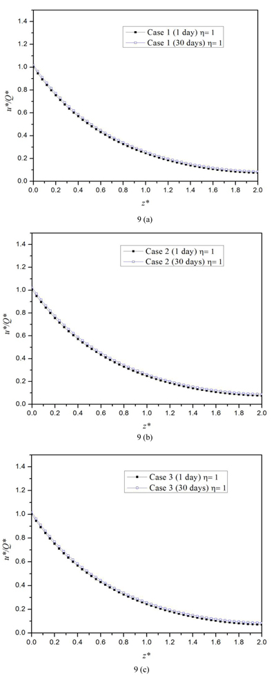 In this section, the influence of the permeability on the behavior of the pile embedded in a three-layered half-space TISS is investigated. The half-space TISS in this section is also composed of by two overlying layers and one underlying layer, i.e., the underlying half-space. Three cases are considered in this section. For Case1, all three layers have equal permeability; Case2 corresponds to a high permeable middle layer; Case 3 to a less permeable middle layer. The parameters for the pile in this section are as follows: length L = 20m, radius R = 0.3 m and the Young’s modulus Ep = 2.5 × 109Pa, while the parameters for the soil are shown in Table 3. Similarly, the thickness, shear modulus µv and coefficient of vertical permeability of the first soil layer are set as the reference length LR, reference shear modulus, µRand reference coefficient of permeability kR, respectively.
