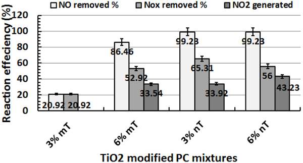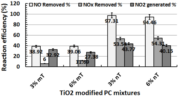 The NO and toluene removal efficiencies of the TiO2-modified PC samples are studied under UV irradiation and subjected to different humidity conditions (50%,100% and 0%). Reference samples showed no removal for the pollutant gases so the removal was noticed to be zero in all conditions.