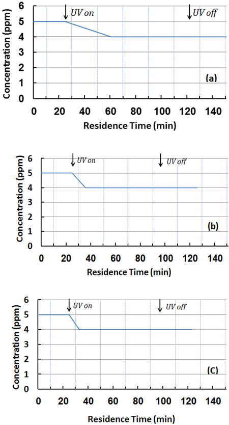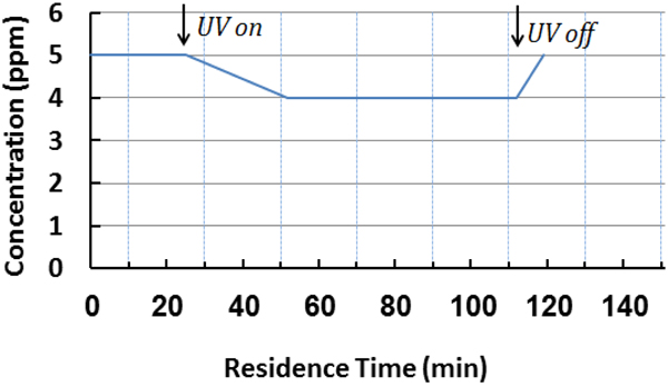 The toluene test results in Table 2 and Fig. (12) shows a lack of removal efficiency for all TiO2-modified PC mixtures except the mixtures modified with 6% nT and tested at 5 ppm gas concentration. The removal was 13.79%, as shown in Table 2. Fig. (12 ) confirms the reduced reaction with water molecules of the gas, which easily returned to its inlet concentration when UV was turned off.