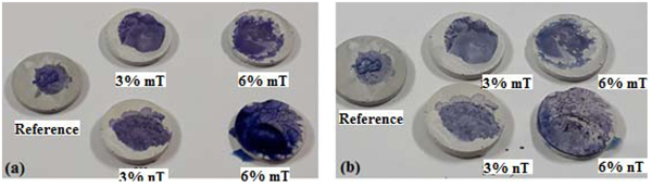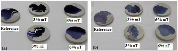 A methylene blue test was implemented in this study to observe the potential photodegradation and degree of lightening of the blue colour, which can be related to the photocatalytic oxidative behaviour of the PC specimens. Furthermore, the hydrophobicity of the PC mixtures can be evaluated by comparing the spot of the TiO2-modified PC specimens with the control. A wider area indicates higher hydrophobicity for the same deposited methylene blue solution volume. Figs. (13, 14 and 15) show the amount of dye degradation after 10 h of exposure to sunlight, halogen and UV illuminations, respectively. Even the PC specimens without TiO2 (i.e., the reference) had a degradation in colour, which highlights the importance of using a reference specimen to avoid misinterpretation [18]. In addition, the surface pigmentation area increased when the dye was exposed on the surface of the nT-modified PC specimens. This increase was more visible with the PC specimens that contained 6% nT. This behaviour can be interpreted as the surface hydrophilicity, which makes dirt and solid particles easily slip off. It is expected that a portion of the methylene blue dye penetrated into the PC matrix in proportion to the porosity of the matrix, which reduces the dye's expansion area. The observed performance of the PC specimens modified with nano-TiO2, which have more voids, as evident in Fig. (6), contradicts this expectation and confirms the hydrophilicity of this matrix.
