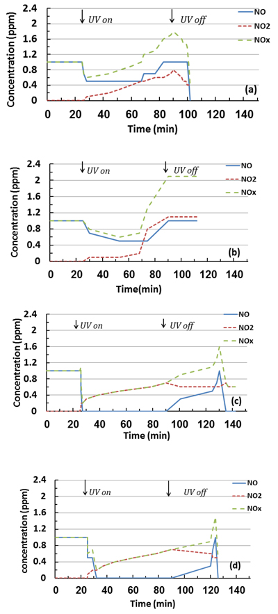In the samples with 3% and 6% micro-replacements, the NO readings returned to 1 ppm because of the saturation with NO gas and reduced PC mixture efficiency in the removal with time (Fig. 4). NO2 values significantly increased at the end of the reaction for the 6% micro-replacement (Figs. 4a and 4b), which confirms that in this stage, the material was saturated and worked as a converter instead of a remover [17]; the nano-replacements continued until UV was turned off without saturation, as shown in Figs. (4c and d) Table 1.