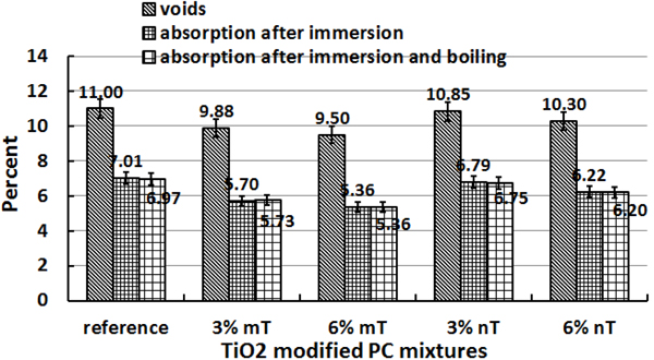 The reaction efficiencies indicate that the removal capacity improvements expected with 6% nT replacement were not clearly evident compared to the 3% nT replacement. The PC specimens with the 6% nT replacement had 3% less NO removal and 1.5% more NOx removal than the PC specimens with 3% nT. This result contradicts the hypothesis that higher TiO2 concentrations will lead to better photocatalytic reaction effects, as reported by another researcher [35]. To explain the results, the water absorption on the control and TiO2-modified PC specimens was tested on three additional disks of each PC mixture according to ASTM C642 [36] to measure the variations in porosity because of the mT or nT replacement. The results are presented in Fig. (6), the absorption test reveals that the PC specimens modified with TiO2 had lower absorption values than the control specimens. The nT replacement in this study actually increased the void percentages and water absorption of the mixtures compared to their counterparts of mT mixture. Higher replacement levels further reduced the voids and absorption results. The observed photocatalytic reaction behaviour may be related to this increase in the voids and absorption by using nT. This behaviour can be explained by the high concentration of TiO2 particles bound with cement paste, which formed a dense solid mass layer [19], increasing the percentages of TiO2 may reduce the reaction activity due to particles agglomerations. The reaction is on the surface instead of being in the inner part of the particles.