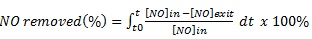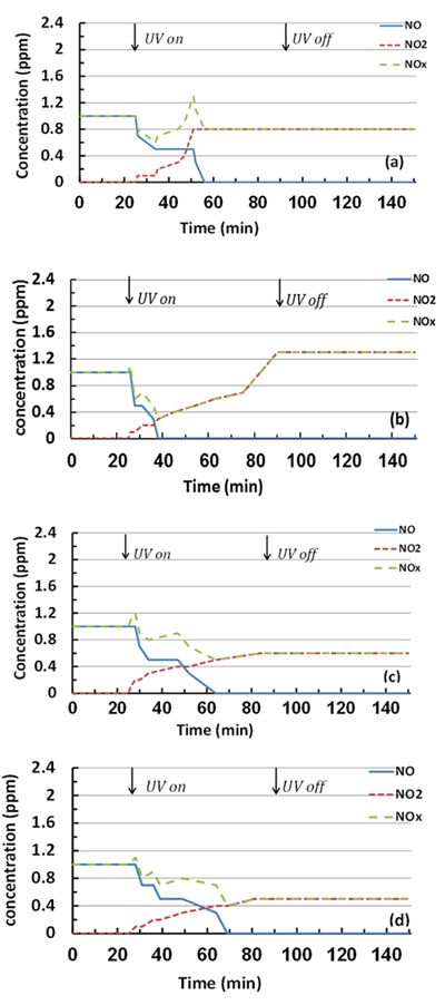 where [NO]in and [NO]exit are the measured levels of NO gas stream before and during the UV irradiation, and t is the time in minutes.
