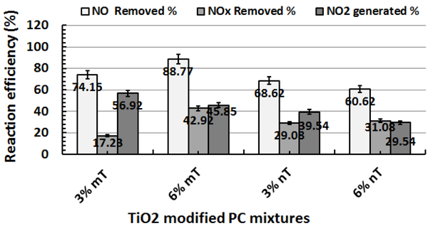 Percentages of NO removed, NO2 generated and NOx removed for TiO2-modified PC photocatalysts under various weather conditions.