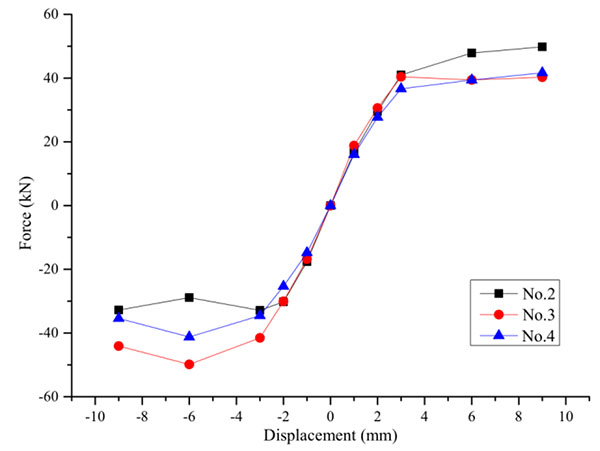 The skeleton curve represents a pivotal stage of the research for a nonlinear seismic response. Its shape is similar to the single loading curve, but the ultimate load decreases as a result of the cyclic load. It is the track of the horizontal force peak in the cyclic loading and reflects a series of stages and characteristics of force and deformation for structural members, such as strength, stiffness, ductility and collapse-resistant capacity, etc [37]. The skeleton curves of No. 2-No. 4 are shown in Fig. (13). The ultimate loads are shown in Table 7.