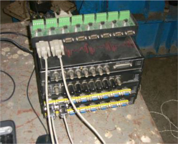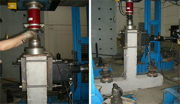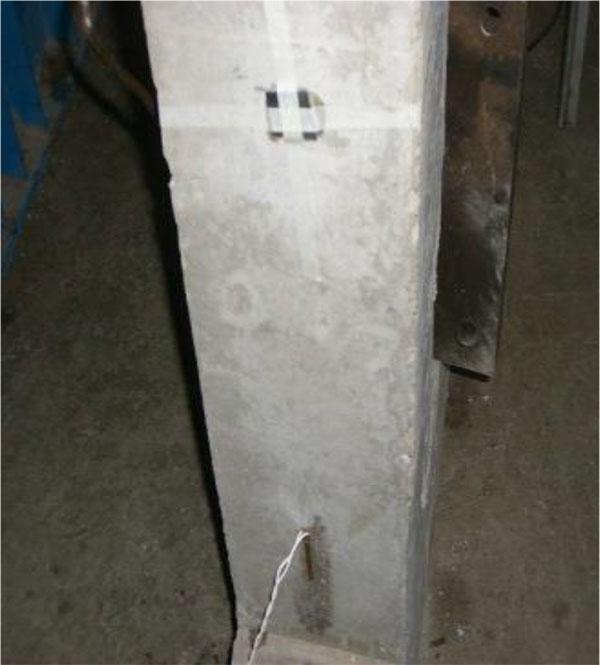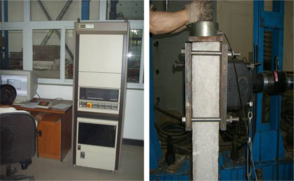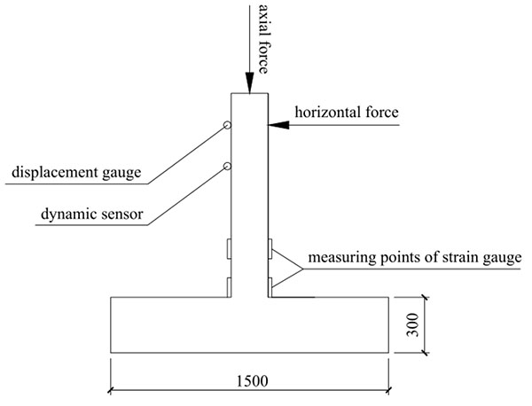 The RC columns were fitted with instruments to measure vibration characteristics, displacement, concrete strains and moisture content. Vibration characteristics were measured by the dynamic sensor and data were collected by DH5922 dynamic test analysis system, as illustrated in Fig. (3). MTS electro-hydraulic servo testing machine and DH3816 continuous data acquisition system in the structural laboratory of Beijing Jiaotong University were employed as lateral loading installation and concrete strain data collection system, as illustrated in Fig. (4). The axial load was applied by vertical hydraulic jack which will be applied to the geometric center of the top of the specimen to ensure that the axial pressure applied will not produce eccentric bending moment. To measure concrete strains in the plastic hinge region, four strain gauges, each 10cm long were attached to the pedestal of RC columns. The concrete strains were measured by electric resistance strain gauges and data were collected by DH3816 continuous data collection system, as shown in Figs. (5, 6) shows the arrangement of the various instruments.