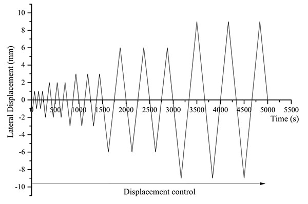 To study the vibration character and hysteresis behavior of RC columns under different moisture contents, four full-scale specimens (No.1-No.4) were subjected to different immersion times. The immersion time was fixed as 0 day, 1 day and 4 days, because the moisture content increases to about 70% fully saturated moisture content at the first interval of 2.5 h, while it increases slowly after 90 h, which can be considered as fully saturated approximately [31]. To obtain the moisture contents of four columns, concrete specimens (100mm×100mm×100mm), the same batch as the columns, were prepared and immersed at the same time. Having been immersed for the same duration as the columns, the moisture contents were obtained by the drying method and they are used as the moisture contents of RC columns, as shown in Table 3. Besides, the vibration characteristics of the four specimens were recorded before the cyclic test. In the cyclic test, the large-scale specimens were installed by geometric alignment, as shown in Fig. (7). An axial force (180kN) was applied according to the design axial compression ratio and kept constant. Then, a cyclic lateral load was applied. The hysteretic loading criteria are presented in Fig. (8). After the cyclic test, the vibration characteristics of No.2-No.4 RC columns were measured.