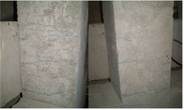 During the loading process, there was no significant difference between the failure modes of all specimens. The crack development of No.2-No.4 specimens is shown in the Figs. (9-11). Two horizontal symmetric cracks appeared first at the base of the specimens. With the load level increasing, some horizontal major fractures developed. At the last load level, crack slopes downward, but the slope angle was smaller.