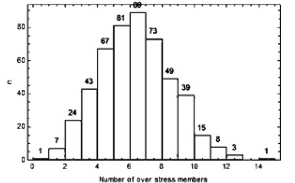 To investigate the effect of position of length imperfections on DLGST behavior, 500 cases with different positions of imperfect members were analyzed by keeping number of imperfect members and size of length imperfections constant. The computer program selects the member to be assigned imperfections randomly. A number of over stress members and total energy of trusses were calculated for every set of random position of imperfect members. In practice, the possibility of a situation violates the design rules can be obtained from the histogram graphs. Fig. (10) shows the number of overstress member histogram. In this figure, x-axis shows the number of over stress members, y-axis shows the number of cases among the 500 analyses corresponding to the x-axis.