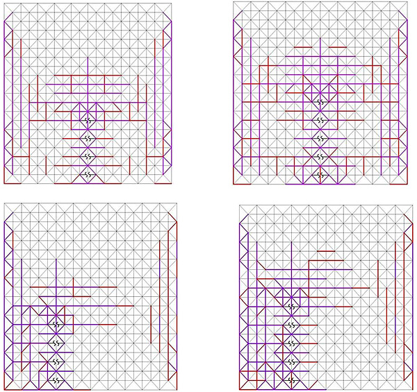 As seen from Figs. (12 and 13), the position of the imperfect members has an effect on the structural behavior. The program prepared in this work has the capability that can define most critical situations among the 500 run and can draw these DLGST with imperfect members as shown in Fig. (14). The figure shows imperfect member positions. These most critical situations might be helpful at the assembly stage to not to get imperfect member especially in this pattern as shown in (Fig. 14).